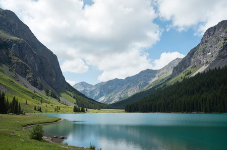 valley with pine forest and rocky peaks on horizon, mountain tourism, outdoor relaxation