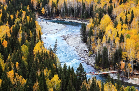 a bird's eye view of xinjiang kanas river landscape in autumn, China