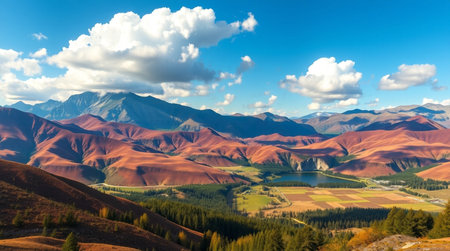 Beautiful landscape with mountains, river and clouds in the blue sky