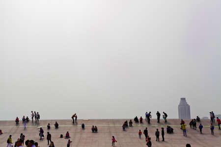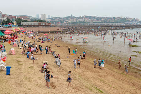 Qingdao / China - August 5, 2015: People bathing at the Qingdao city beach, Shandong province, China