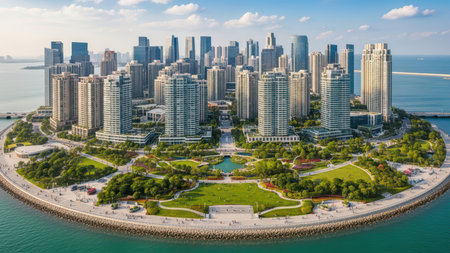 Scenic aerial view of modern coastal cityscape with skyscrapers and lush park.