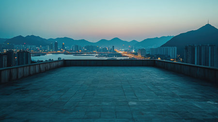 empty floor with backdrop on modern cityscape at sunrise time