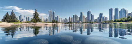 Majestic Urban Landscape Vibrant City Reflected in Calm River Waters Under a Clear Blue Sky