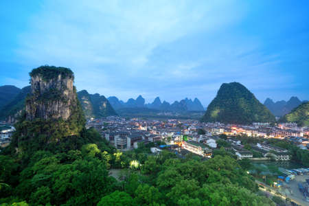yangshuo county town at night,beautiful karst mountain landscape in guilin, China