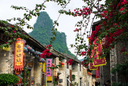 HUZHOU, CHINA - MAY 2, 2017: Huang Yao Ancient Town in Zhaoping county, Guangxi province. Traditional Chinese architecture and decoration