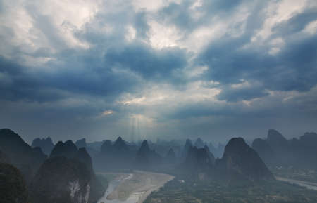 Sunlight over the beautiful karst landscape of Xingping, Guilin, China