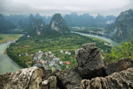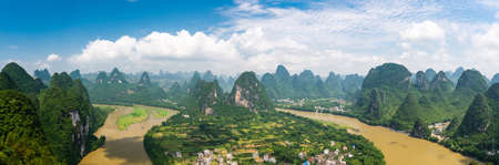 Panoramic view of karst mountains and Li river in Yangshuo, Guilin, China