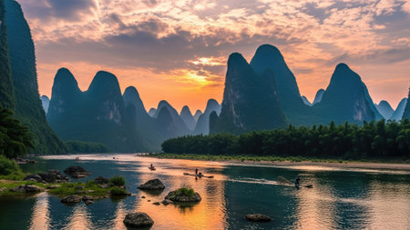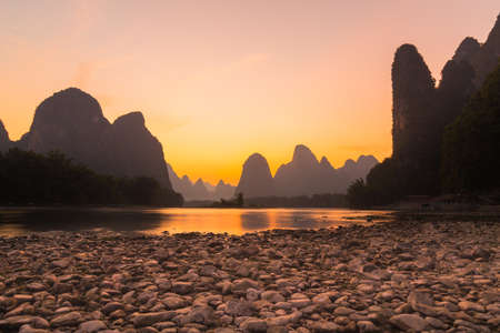 Sunset scene in Guilin, China, with stunning rock and river