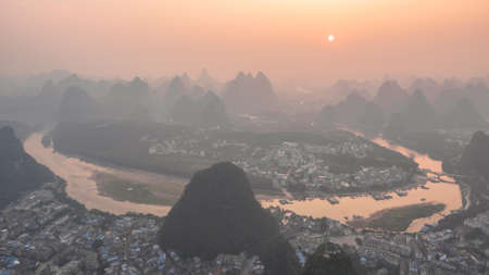 Breathtaking aerial view over beautiful karst mountain landscape and Li River covered with haze or fog at sunset in Yangshuo County, China