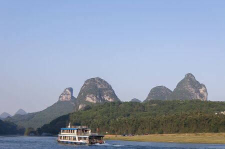 Yangshuo, China - July 14, 2010: Cruise ship with tourists travels the magnificent scenic route along the Li river from Guilin to Yangshou. The Li River is renowned as being one of “the world’s top 10 watery wondersâ€