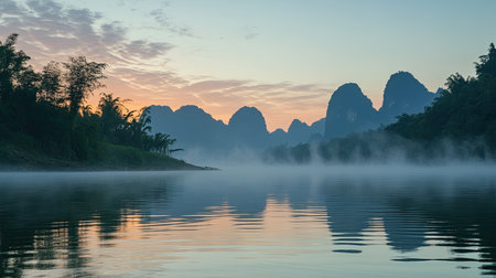 Majestic mountains frame a serene river at sunrise, with gentle mist rising from lush greenery. A tranquil landscape that inspires adventure and exploration.