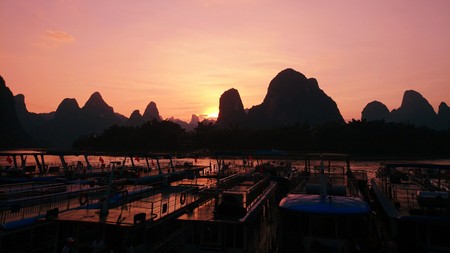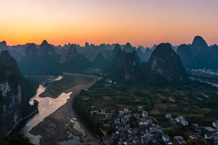 Amazing sunset over the karst landscape of Xingping, Guilin, China