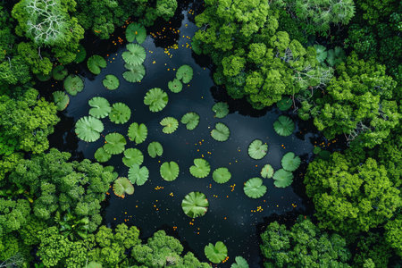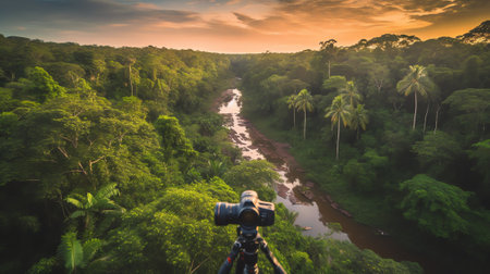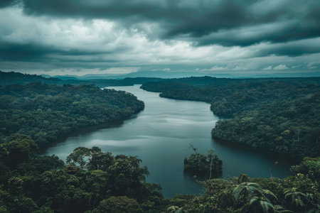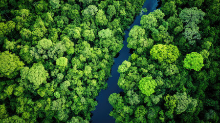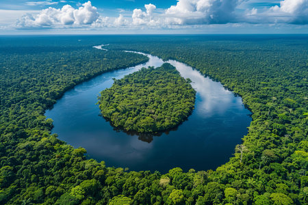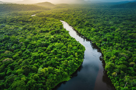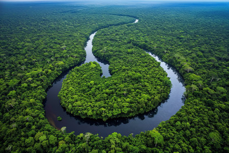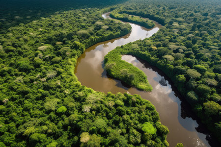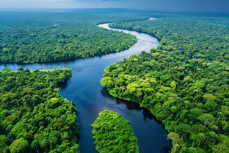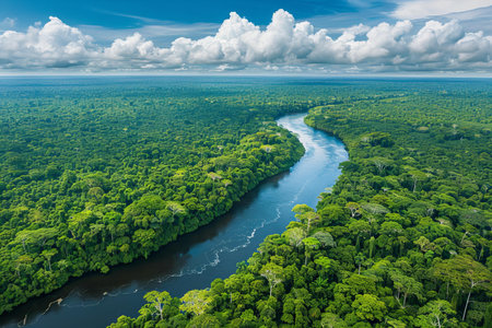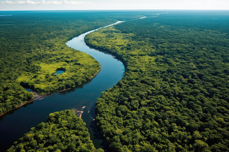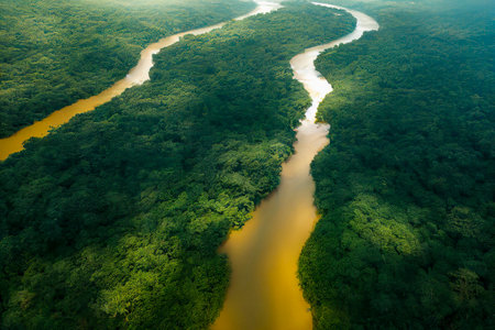 Digital artwork of aerial view of the amazon rainforest and river, showcasing its rich vegetation and wildlife. the shot is taken from above using drone photography techniques to capture panoramic views of the jungle's expanse. this aerial perspective highlights the vastness of the forest with lush