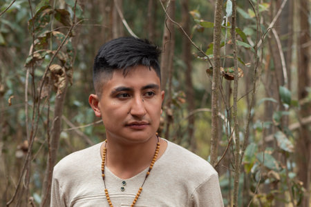 Medium short shot of a young Latin man looking seriously at the horizon in a forest with out of focus trees in the background