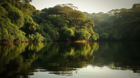 A tranquil river in a lush rainforest at dawn. Golden sunlight filters through the trees, creating a serene and peaceful atmosphere.