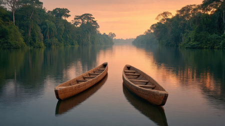 A breathtaking view captures two wooden canoes peacefully floating on a serene river at dawn, surrounded by lush greenery reflecting the vibrant colors of the morning sky.