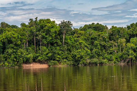 On a boat trip tour to Meeting of waters of Rio Negro and Amazon River with tropical jungle rainforest and blue cloudy sky in Iranduba Manaus State of Amazonas Brazil.