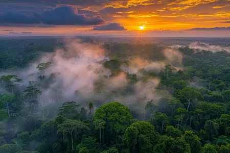 cloud forest with misty morning sunrise, aerial view of the amazonas, created with generative ai