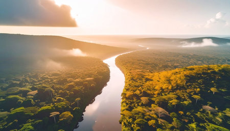 Golden sunset over a winding river cutting through a lush rainforest, creating a breathtaking aerial landscape of untouched wilderness, Ai-Generated.