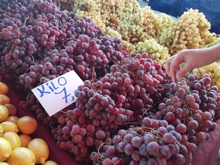 ANTALYA, TURKEY: Grapes on sale in a street market. Grocery traditional Turkish bazaar in Antalya, Turkey.