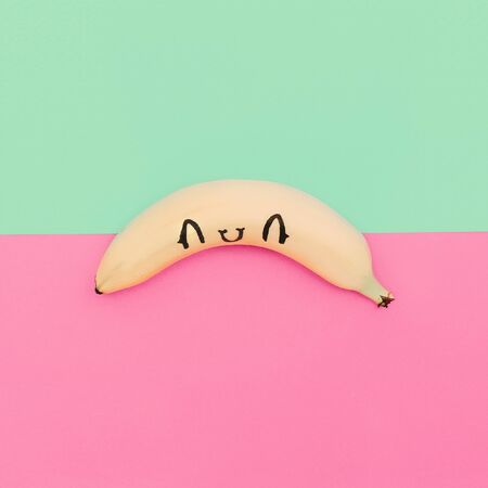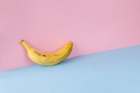 Minimalist image of a banana on a light blue and pink background. Copy space available.