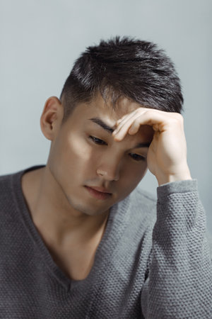 Pensive Young Asian Man Resting Head On Hand, Thoughtful Close-Up Portrait