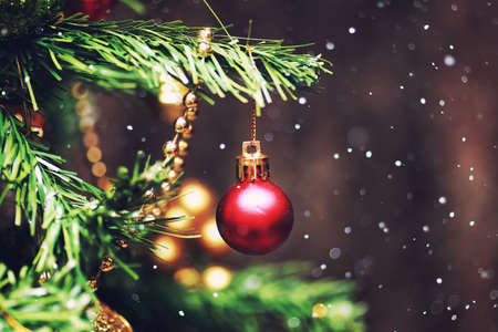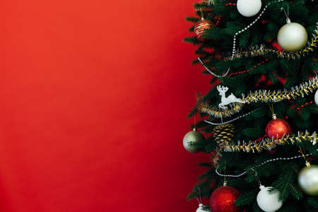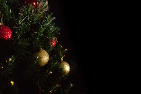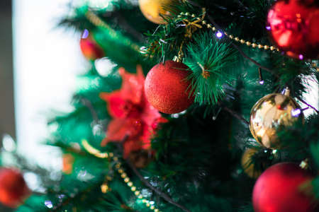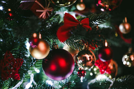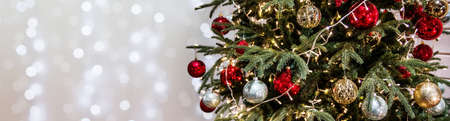 Decorated Christmas tree on blurred background. Christmas decoration. Hanging red balls on pine branches christmas tree garland and ornaments over abstract bokeh background with copy space