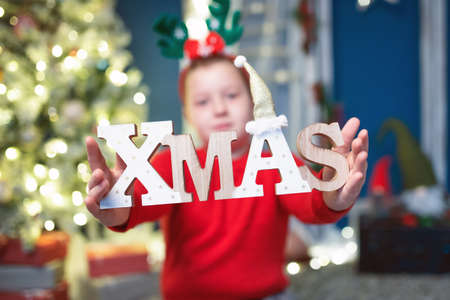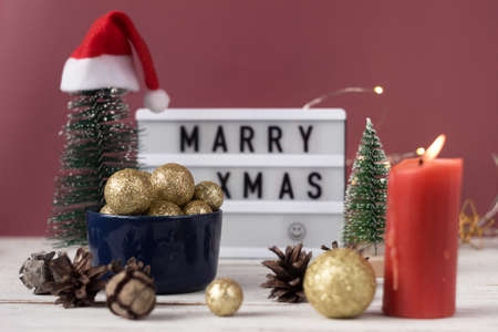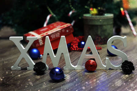 Christmas concept. Light box with the inscription Happy Xmas, Christmas tree and holiday accessories.