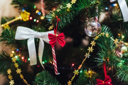 Close-up photo with decorations of christmas tree. Selective focus (Narrow depth of field). Christmas gold bow on a christmas tree branch. New Year's concept