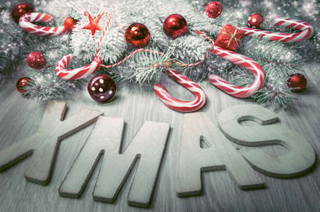 Wooden letters Xmas and winter decorations in red, beige and green. Merry Christmas! This image is toned.