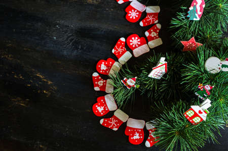 Close up branch of christmas tree with colorful balls and toys. New Year background. Winter backdrop