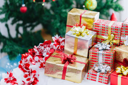Christmas gift box and Christmas decoration with Christmas tree at back side. Copy space for your text.