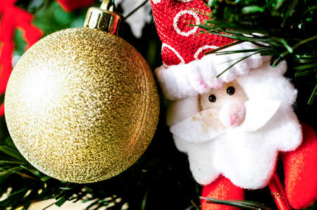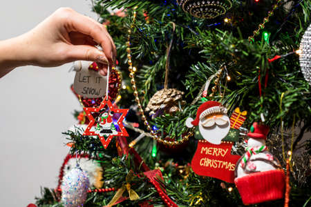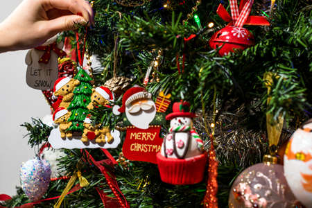 Hanging Christmas decorations and ornaments in the Christmas tree