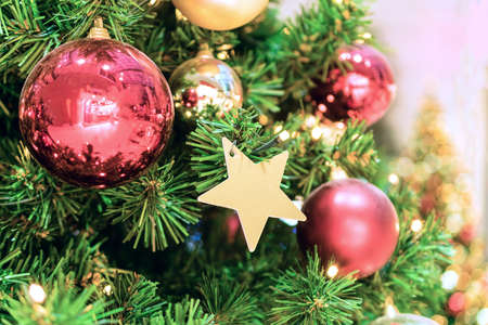 Greeting Season concept.hand setting of ornaments on a Christmas tree with decorative light