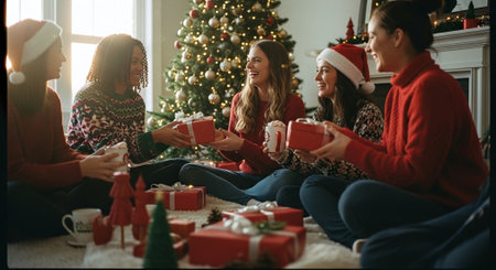 A group of friends celebrating christmas together, exchanging gifts in a cozy living room decorated with a christmas tree and festive ornaments