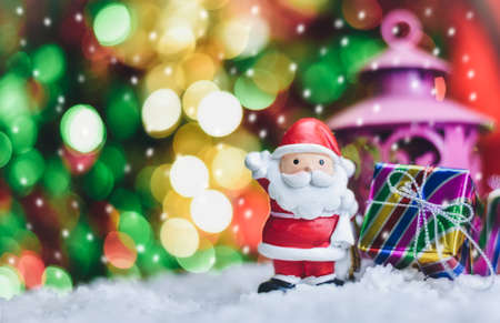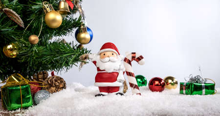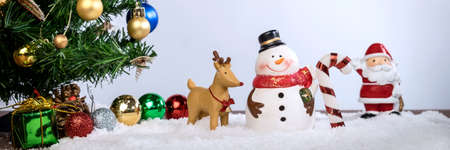 Christmas decoration Holiday or new year with Santa Claus and snowman on snow background and copy space.