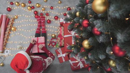 A close-up view of a Christmas tree adorned with wrapped gifts, ornaments, and festive decorations, creating a warm and inviting holiday atmosphere.