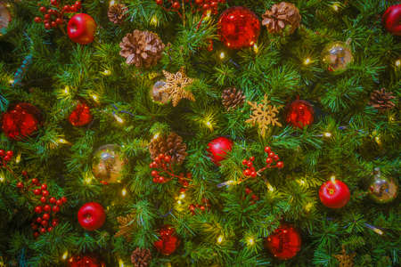 Christmas tree with many beautiful ornaments background. Winter holidays concept.