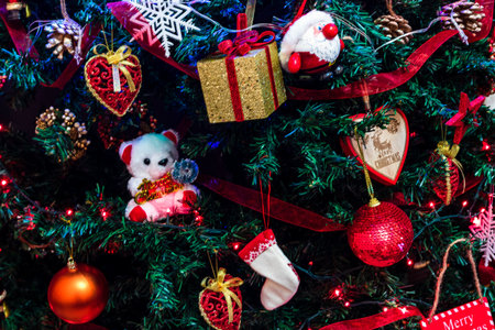 Christmas tree assembled with ornaments. Red, silver and gold balls, gift boxes, lights, Santa Claus and others. Selective focus.