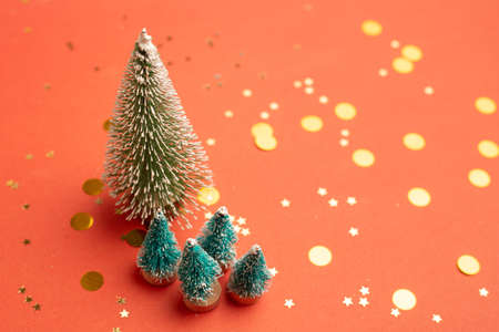 Mini Christmas trees on a red bright background. christmas background