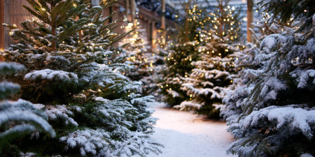 Christmas tree farm covered in snow with twinkling lights creates a festive atmosphere during the holiday season