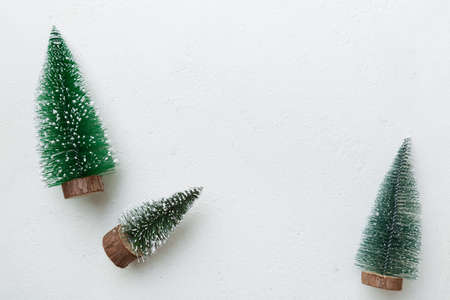 Small decorative Christmas trees with New Year decor on white putty background, top view.