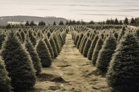 Christmas tree growing in a nursery near the forest. Trees for the holiday. Close-up shot AI generated image