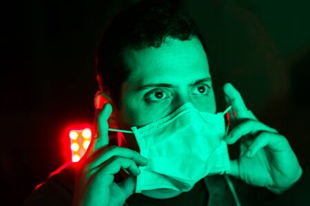 A young man wearing protective mask against the viruses and infections. Concept of protection against viruses and diseases. Green studio lighting. Close up.