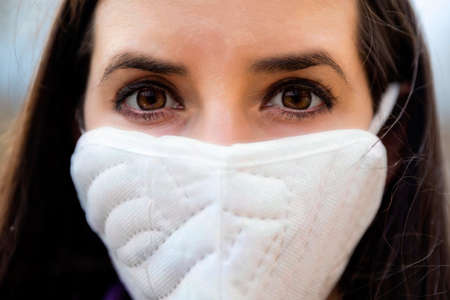 Young woman wearing a protective surgical face mask during the Coronavirus disease (COVID-19) outbreak epidemic. Close up portrait with a multiple use white protection mask on the face.