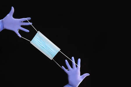 blue medical or Surgical face Mask. Virus Protection. Black background. Space for entering text