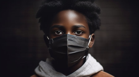 Portrait of blond young boy in white shirt and black medical mask at home : Generative AI