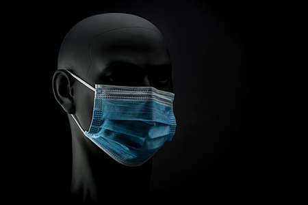 A blue medical mouth and nose mask on a dark dummy head against a black background