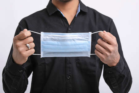 A young man holds a medical mask in his hands. Protection and Prevention COVID-19