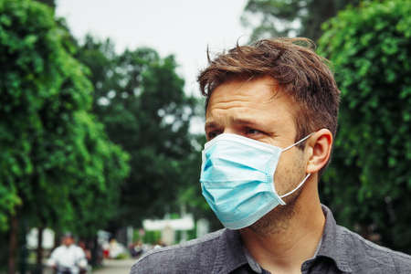 Handsome young European man in a park with a medical face mask on. Closeup of a 35-year-old male in a respirator to protect against coronavirus